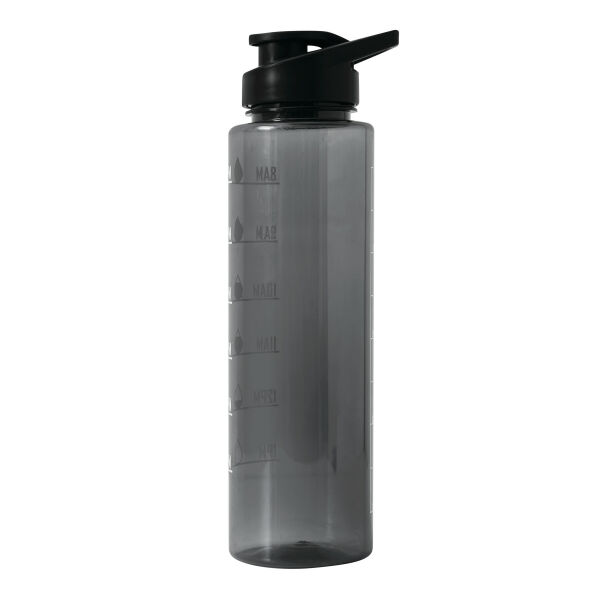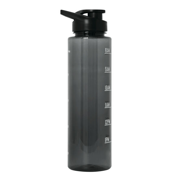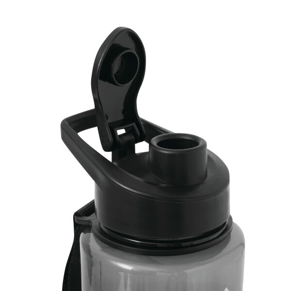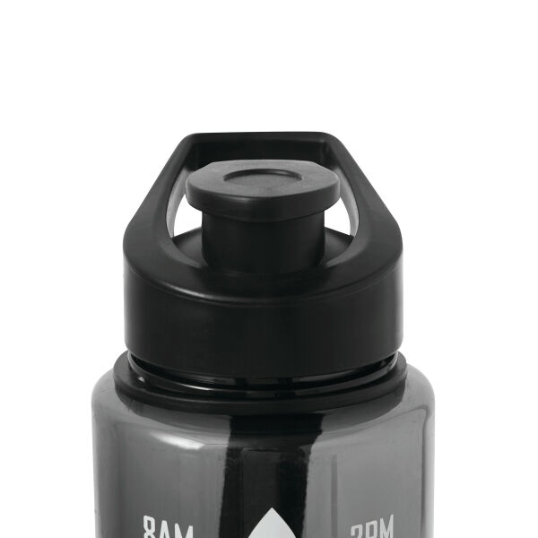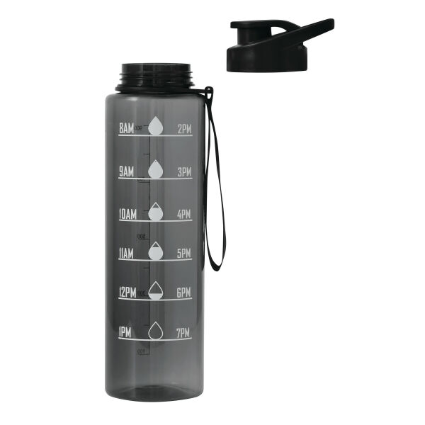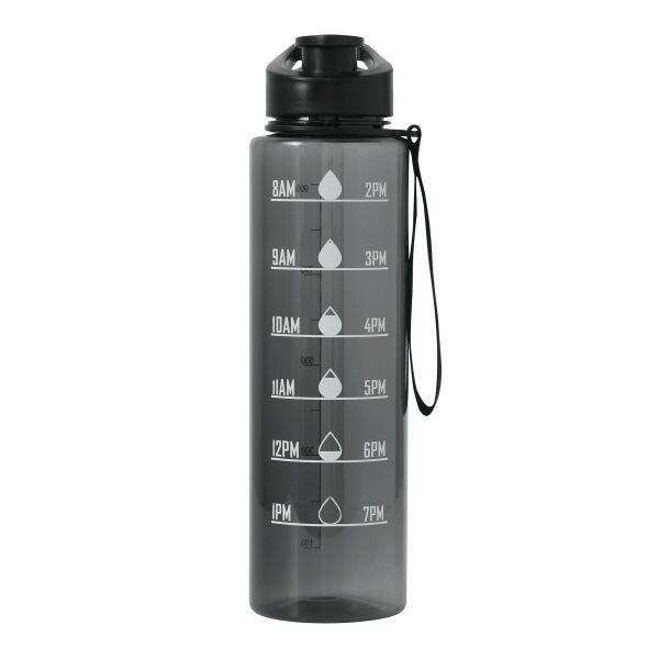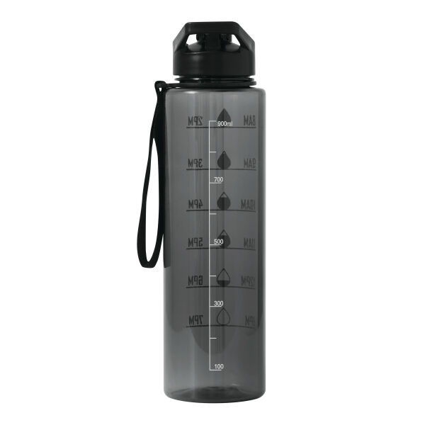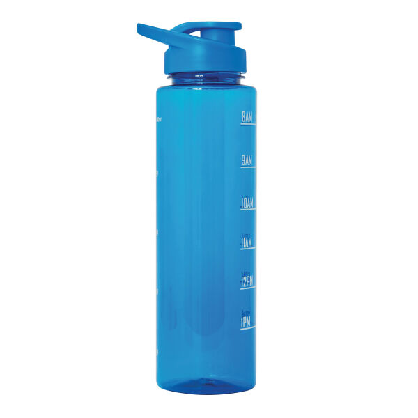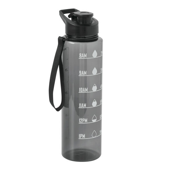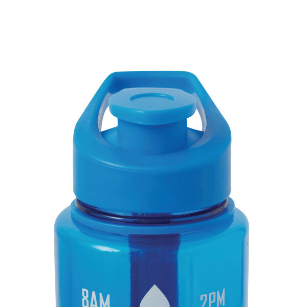 Sportdrinkfles AQUA LEVEL: doorzichtige, gekleurde drinkfles van duurzaam PETG, bijpassend kunststof deksel met schroefdop, siliconen afdichtring, geïntegreerde drinkopening die open kan worden geklapt en draaggreep, motiverende tijd- en inhoudsschaal (uren / ml), met draagriem, inhoud ca. 1.000 ml.