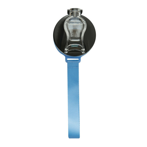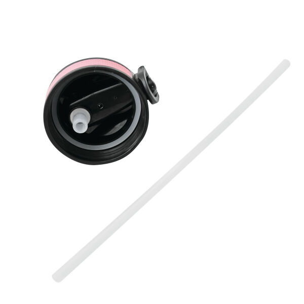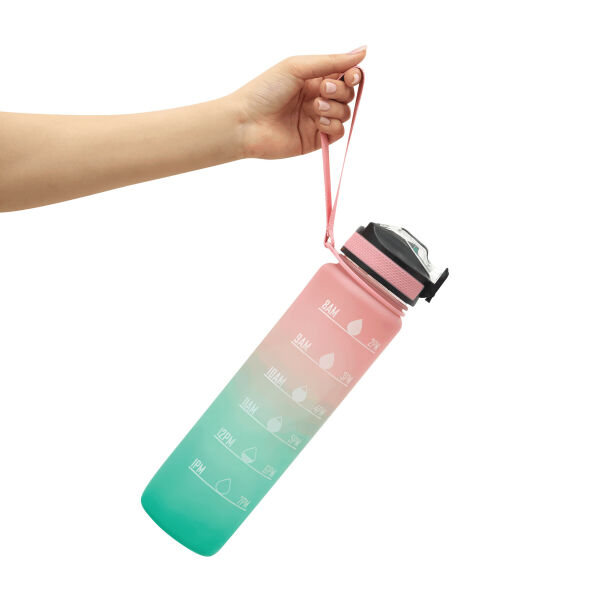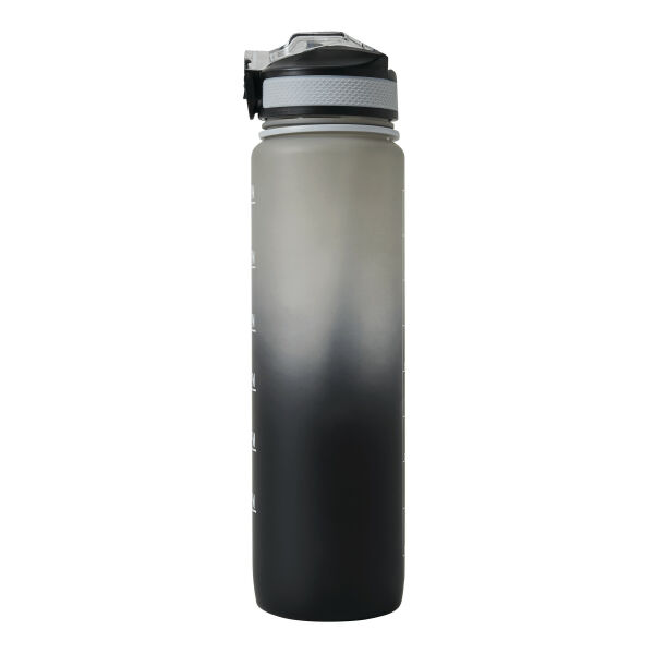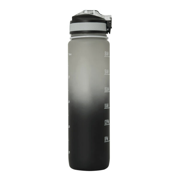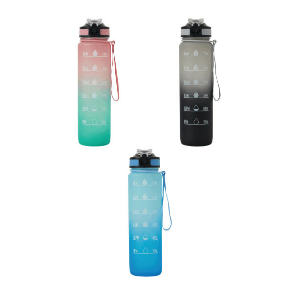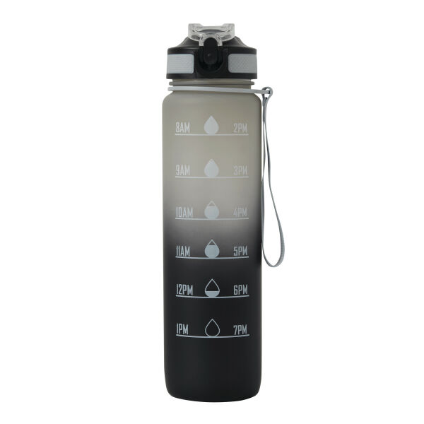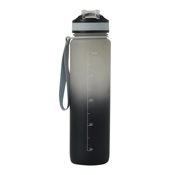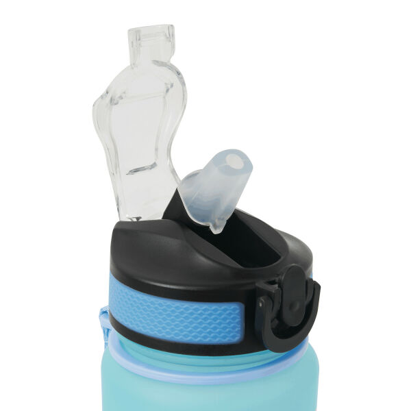 Sportdrinkfles HYDRO LEVEL: gefrostede gekleurde drinkfles van duurzaam PETG, bijpassende kunststof deksel met schroefsluiting en siliconen afdichtring, met één hand te openen flip-top deksel met veiligheidsvergrendeling, geïntegreerde, afneembaar rietje met zacht siliconen mondstuk, motiverende tijd- en inhoudsschaal (uren / ml), met draagriem, inhoud ca. 1.000 ml, verpakt in een doos.