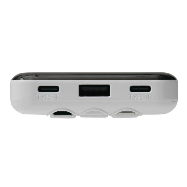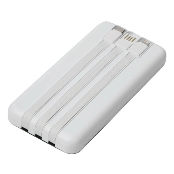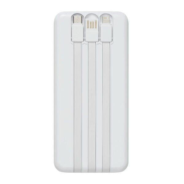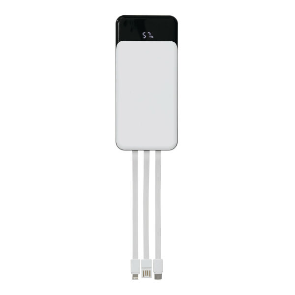 Powerbank POWERSTOCK: geschikt voor smartphones en USB-gevoede apparaten, incl. 3 geïntegreerde laadkabels aan de achterkant (USB-C, Lightning®, USB-A), met laadniveau-indicator in procenten, aan-/uitschakelaar, 2 USB-C in-/uitgangen en 1 USB-A uitgang, invoer: 5V/2A, uitvoer: 5V/2A (max.), capaciteit: 10.000 mAh, krachtige lithiumaccu, verpakt in een doos