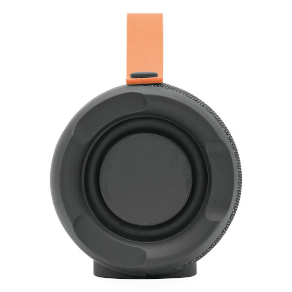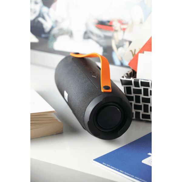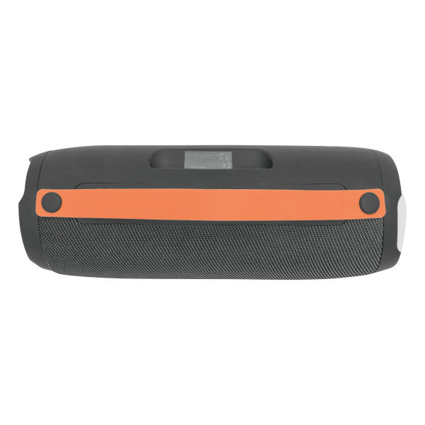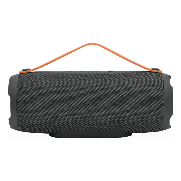 Wireless speaker MEGA BOOM: vermogen 2 x 5 Watt, voor koppeling met mobiele telefoon, tablet, etc., ook aan te sluiten op externe apparaten d.m.v. AUX-IN-aansluiting, MP3 afspeelbaar via USB en Micro-SD kaart, handsfree-functie, met FM radio functie, krachtige batterij, capaciteit: 1.200 mAh, oplaadtijd ca. 2 uur, speelduur ca. 2 - 3 uur, bereik ca. 10 m. incl. oplaadkabel met Micro-USB stekker (lengte: ca. 34,5cm.) en audiokabel (lengte: ca. 51cm.), incl. klein graveerplaatje, oranje siliconen handvat.
